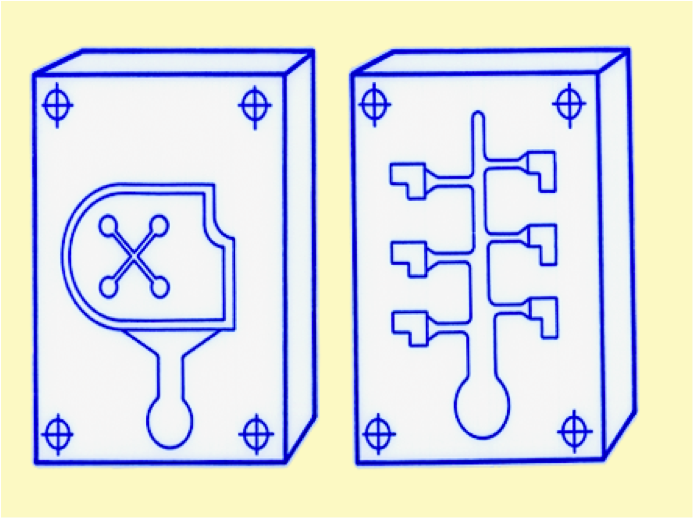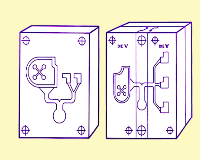 Right Graphic: Unit frame with Die A & Die B. Die A is a unit mold with 1 cavity; Die B is a unit mold with 3 cavities. The center is part of the unit frame.